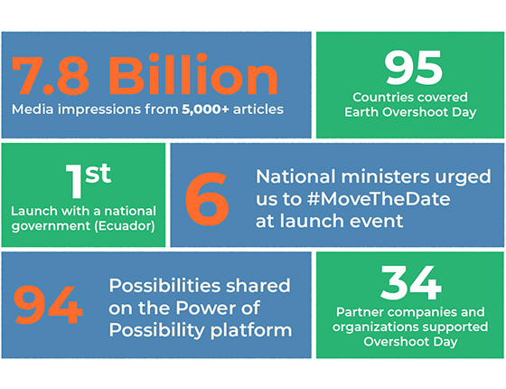 The momentum is building to #MoveTheDate of Earth Overshoot Day! The picture on the right summarizes the impacts for 2022. The button below links you to selected media stories for 2024. For more media uptake and Earth Overshoot Day tools visit the dedicated website here.